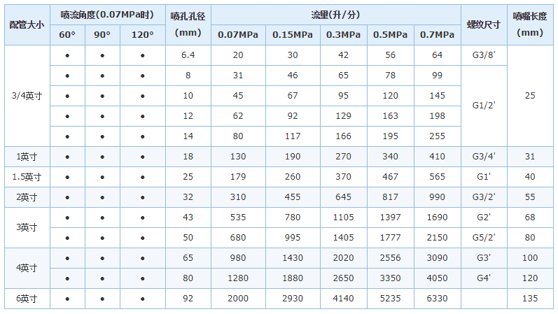 規(guī)格型號為6.4~50mm的噴嘴均用氧化鋁陶瓷、316不銹鋼鑄件、聚丙烯、聚四氟乙烯制造。氧化鋁陶瓷和316不銹鋼噴嘴為六角形的。聚丙烯、聚四氟乙烯噴嘴為平臺形或圓形的。規(guī)格型號為65~92mm的噴嘴無論是用聚丙烯還是聚四氟乙烯都只有圓形的。這些噴嘴也可用其它各種材料制成,應(yīng)用于特殊領(lǐng)域。